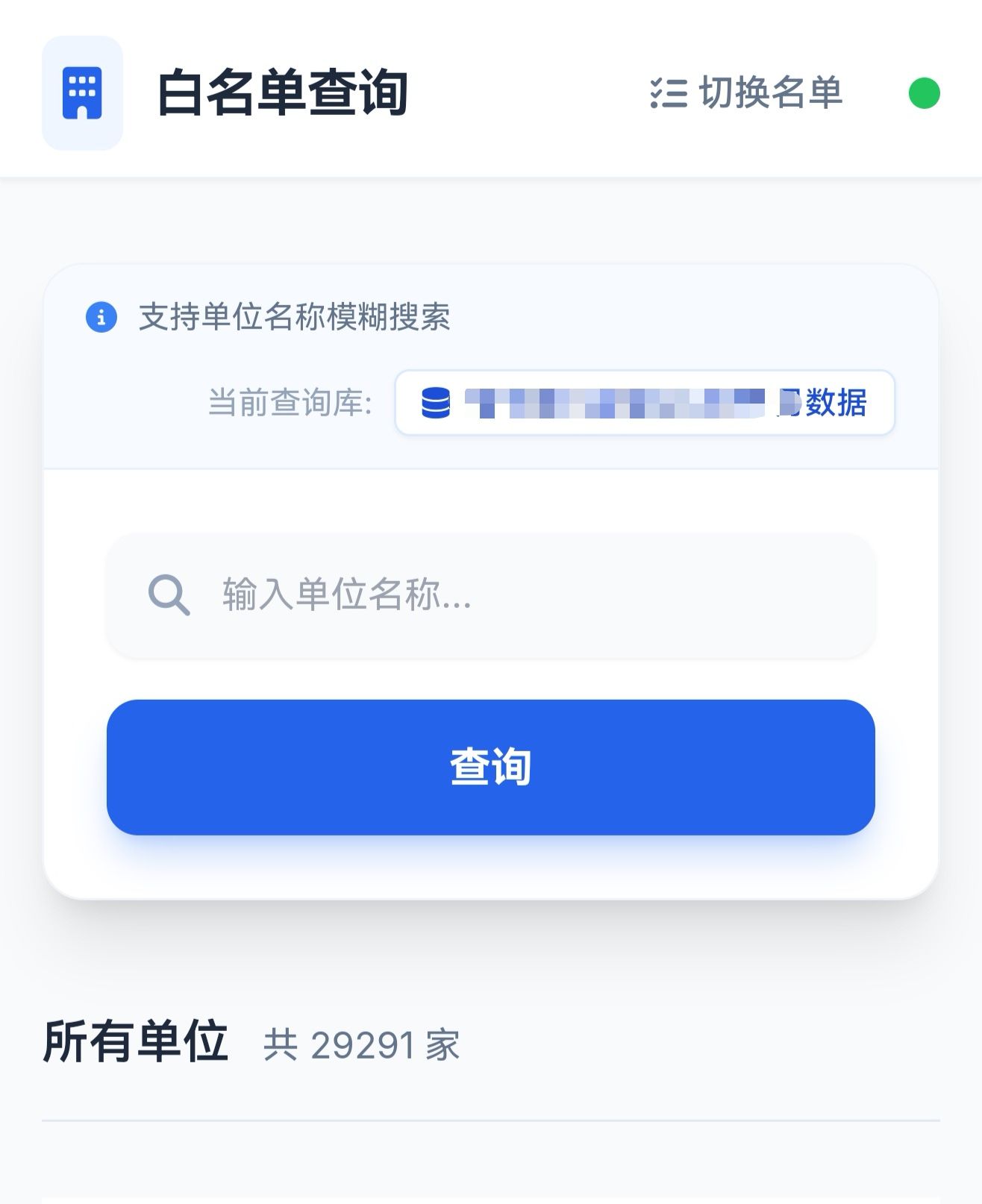 这只是一个功能很简单的名单查询工具,后台导入数据,然后需要的时候在前台查询相关单位是否在名单中,仅比使用Excel搜索方便那么一点点,是否有其他人使用取决于我在后台上传的名单有没有价值。这不重要,方便自己和身边有需求的同事使用即可。 最近叫AI设计的限时二维码跳转页面风格看起来挺不错,将这个工具页面也使用同样的风格; 增加多名单支持,可以在后台上传多个名单数据,前台查询时可以切换; 效果如下:白名单查询