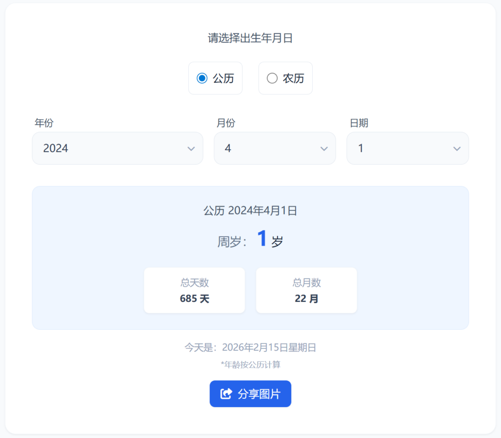 输入出生年月日,马上计算出当天的年龄;后又想到添加农历输入,会自动转换成公历再计算;再添加了一个生成图片分享功能。