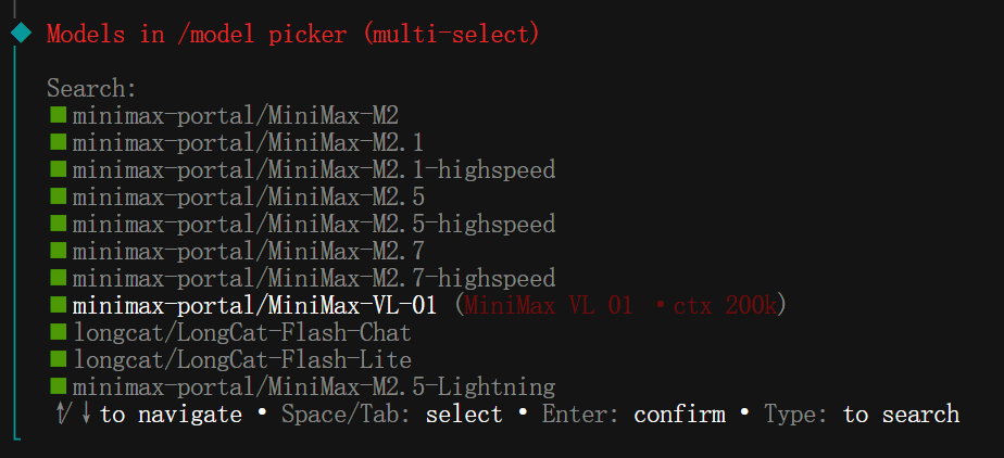 官方 Token Plan 套餐里没提,那去 OpenClaw 配置中看看 MiniMax OAuth 接口,果然有 MiniMax-VL-01 选项。这不知是何意,那我就全部打勾,看以后还有没有惊喜。😄