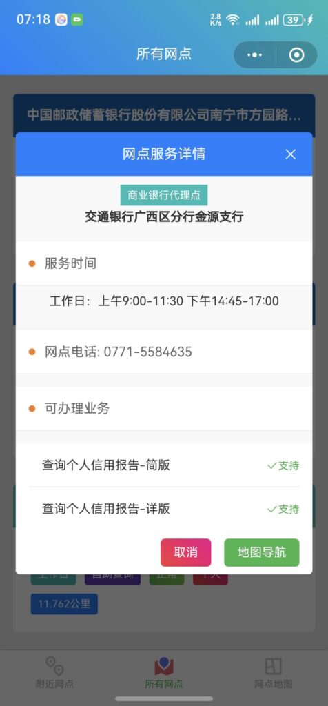 除了人民银行征信服务大厅,部分银行网点也配置了可以查询详细版征信报告查询设备,通过下面的小程序可以查询支持的网点